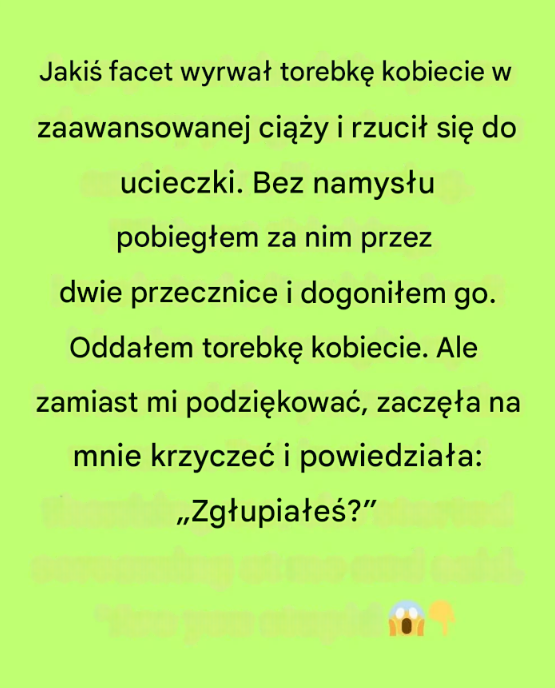 Jakiś facet wyrwał torebkę kobiecie w zaawansowanej ciąży i uciekł. Bez namysłu pobiegłem za nim przez dwie przecznice i dogoniłem go. Oddałem torebkę kobiecie.