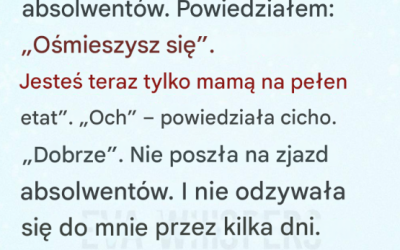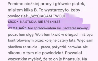 CZĘŚĆ 1 — UMOWA, KTÓRA NIGDY NIE DOTYCZYŁA MIŁOŚCI Studia wiązały się z pewnymi warunkami Kiedy ojciec Lacey zaproponował, że zapłaci za studia, zabrzmiało to jak prezent. Ale wiązało się to z tak rygorystycznymi zasadami, że bardziej przypominało kontrakt niż wsparcie. Zgodziła się jednak — wierząc, że jeśli spełni wszystkie warunki, w końcu zasłuży na odrobinę wolności. Nie zdawała sobie sprawy, że zasady te nigdy nie miały na celu pomóc jej osiągnąć sukces. Ich zadaniem było ją kontrolować. Niektóre długi spłaca się w milczeniu. Inni z czasem domagają się głosu. Umowa przy kuchennym stole Niektórzy rodzice ustalają zasady. Moje ultimatum zostało postawione. Miałem siedemnaście lat, kiedy mój ojciec, Greg, posadził mnie przy kuchennym stole. Teczka papierowa leżała przed nim schludnie, a zadowolony uśmieszek na jego twarzy podpowiedział mi, że to nie będzie zwykła rozmowa. Miał to być kontrakt. „Możesz iść na studia za moje pieniądze, Lacey” – powiedział, krzyżując ramiona. „Ale są pewne warunki”. Następnie wymienił je tak, jakby stanowiły część Karty Praw Rodziców. Nie ma ocen niższych niż A-. Każda klasa musiała uzyskać od niego wcześniejszą akceptację. Raz w tygodniu siadaliśmy razem, żeby omówić sylabusy, terminy i profesorów. Mówił spokojnie, popijając kawę i zajadając się tartą z kremem, i tłumaczył mi wszystko tak, jakbym była ryzykowną inwestycją, a nie jego córką. „Może to zabrzmieć ostro” – powiedział w końcu. „Ale uczę cię odpowiedzialności”. Tak naprawdę uczył kontroli. CZĘŚĆ 2 — DORASTANIE POD MIKROSKOPEM Ojciec, który zawsze szukał wad Mój ojciec nigdy nie był zwykłym gadułą. On dokonał inspekcji. Przeanalizowano. Szukano słabych punktów, jakby to był sport. Kiedy chodziłem do gimnazjum, codziennie po kolacji przeszukiwał mój plecak, grzebiąc w pogniecionych arkuszach ćwiczeń i na wpół zaostrzonych ołówkach, jakby spodziewał się znaleźć przemyt. W liceum sytuacja się zaostrzyła. Jeżeli nauczyciele spóźniali się z wystawieniem ocen online, wysyłał je e-mailem. Kiedyś przesłał mi zrzut ekranu z mojego portalu ocen, na którym było pojedyncza litera B zaznaczona na czerwono. W temacie wiadomości widniał następujący tekst: Wyjaśnij mi to, Lacey. Dopóki tego nie zrobisz, nie będzie kolacji. Kilka sekund później wysłał tę samą wiadomość. Innym razem wezwano mnie do gabinetu doradcy, ponieważ mój ojciec oskarżył nauczyciela o ukrywanie zadania domowego. Nie ukrywała tego. Po prostu jeszcze tego nie oceniła.