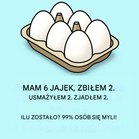 „Mam 6 jajek. Rozbiłem 2, usmażyłem 2 i zjadłem 2. Ile jajek mi zostało?”