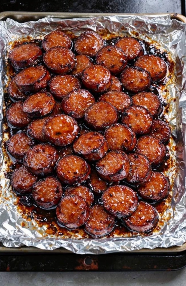 Wypróbuj Candied Kielbasa Bites: wędzoną, czosnkową kiełbasę glazurowaną w słodko-lepkim sosie z brązowego cukru, ketchupu i chrzanu, a następnie pieczoną do momentu, aż się skarmelizuje i nabierze połysku.