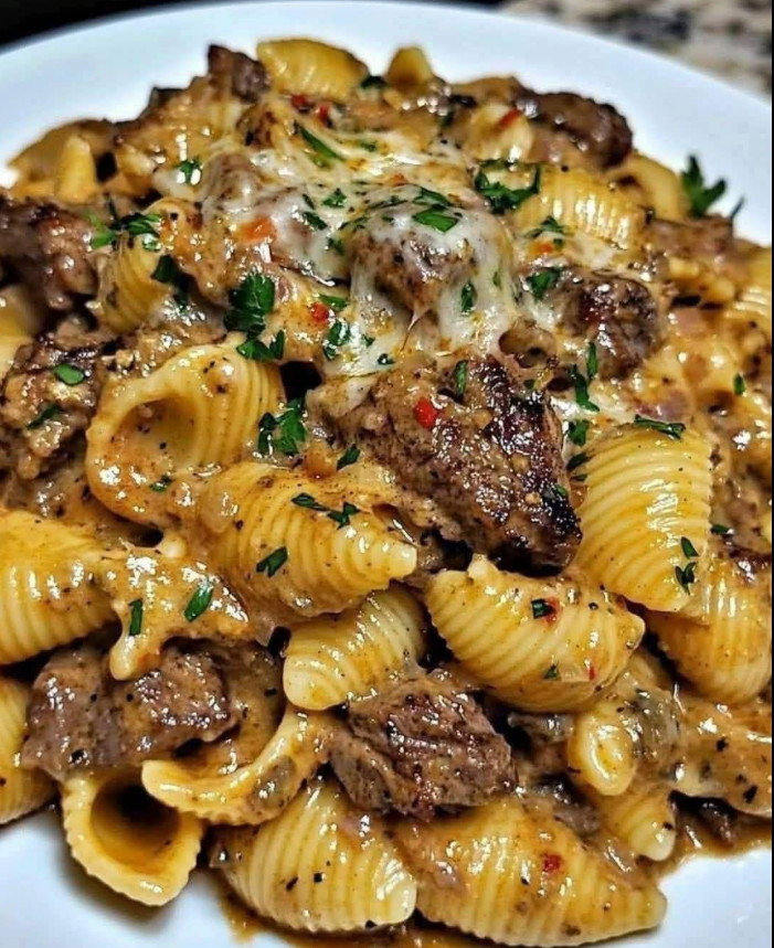 Oto te kremowe muszle z papryką i stekiem : delikatne kawałki steku i pulchne muszle makaronowe polane aksamitnym, dymno-słodkim sosem – wszystko przygotowane na jednej patelni, podczas gdy makaron się gotuje. Bez skomplikowanych technik. Bez niejasnych składników. Zaledwie 30 minut od spiżarni na talerz , a bogaty, satysfakcjonujący komfort, który sprawia, że wszyscy odetchną z ulgą.