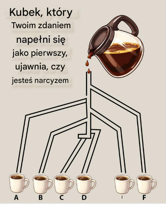 Na pierwszy rzut oka ten obrazek wygląda jak prosta łamigłówka logiczna. Kawa płynie siecią rurek do sześciu kubków oznaczonych literami od A do F. Wyzwanie wydaje się proste: który kubek napełni się pierwszy?
