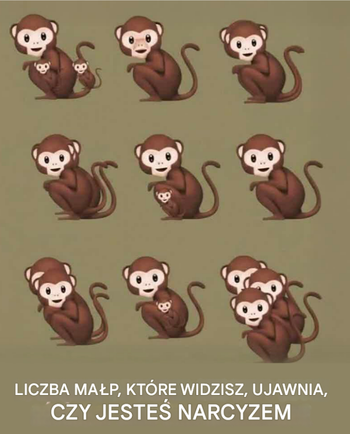 Na pierwszy rzut oka obrazek wydaje się zabawny, wręcz dziecinny: małe małpki ustawione w rzędzie na prostym tle. Nic nadzwyczajnego. Jednak jedno zdanie od razu przykuwa uwagę: „Liczba małp, które widzisz, określa twoją osobowość”. Intrygujące, prawda? Więc, jak wszyscy inni, zaczynasz liczyć. I tu robi się ciekawie, bo ten obrazek tak naprawdę nie dotyczy małp… chodzi o twój mózg, a może nawet o twoją narcystyczną stronę , tę bardzo ludzką skłonność do szukania swojego odbicia w tym, co widzimy.