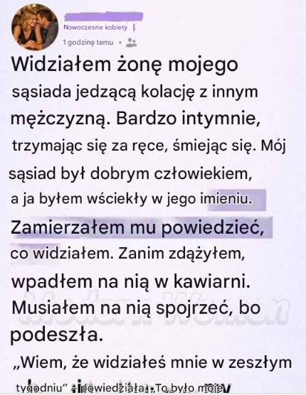 Byłem w połowie kolacji w małej włoskiej restauracji na Maple Street – takiej z przyćmionym oświetleniem, zniszczonymi drewnianymi stołami i unoszącym się zapachem czosnku i wina. Właśnie uniosłem widelec, gdy coś przykuło moją uwagę.