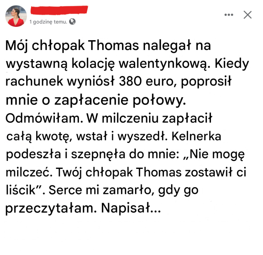 Podzielenie rachunku samo w sobie nie jest niczym niezwykłym. Wiele par tak robi. Ale w tym przypadku kontekst zmienia wszystko. To był jego pomysł. Jego niespodzianka. Jego „wyjątkowy wieczór”.