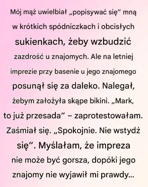 Mój mąż, Mark, zawsze powtarzał, że jest ze mnie dumny i przez długi czas mu wierzyłam. Jego komplementy dotyczące mojego wyglądu były dla mnie jak miłość – dopóki nie zdałam sobie sprawy, że to nie podziw, a raczej afisz. Namawiał mnie do krótkich spódniczek, obcisłych sukienek, wyzywających strojów, zawsze chętny, by popisać się mną przed innymi. Próbowałam wmówić sobie, że to nieszkodliwe, że może po prostu wyraża w ten sposób dumę. Ale w głębi duszy czułam się z tym niekomfortowo, w sposób, którego nie mogłam ignorować w nieskończoność.