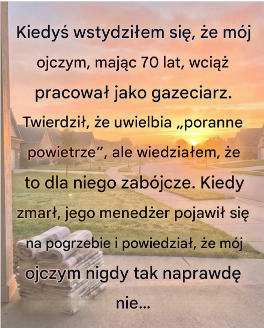 Pracowałam w finansach korporacyjnych. Mieszkałam w ładnym mieszkaniu w mieście. Kiedy współpracownicy pytali, czym zajmują się moi rodzice, mamrotałam coś niejasnego o „emeryturze” i zmieniałam temat najszybciej, jak mogłam. Siedemdziesiąt lat, rzucanie papierów na wilgotne trawniki przed wschodem słońca – to było jak cicha porażka. Jakbym nie zrobiła wystarczająco dużo, żeby dać mu inne zakończenie.