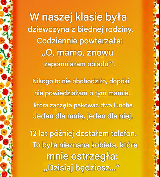 Następnego ranka mama spakowała dwa lunche – jeden dla mnie i jeden „na wszelki wypadek, gdyby ktoś potrzebował”. Od tamtej pory stało się to naszą cichą rutyną. Podsuwałem jej dodatkowy lunch i jedliśmy razem. Stopniowo zaczęła więcej rozmawiać, więcej się śmiać, a te wspólne lunche stały się małą, cenną częścią naszego dnia.