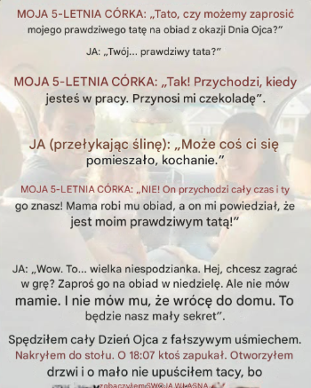 Nie dałem po sobie poznać paniki. Nie pozwoliłem, by gniew przejął kontrolę. Zamieniłem to w „niespodziankę obiadową” z okazji Dnia Ojca, dając jej możliwość swobodnej rozmowy, a sobie – cichego zbierania wskazówek. Spodobał jej się ten pomysł, zachwycona, że może przekuć swoje myśli w misję. Tymczasem w mojej piersi uformował się zimny ciężar – instynkt, że coś dzieje się tuż pod moim nosem.