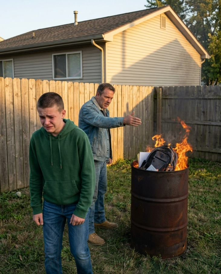 Nie tylko garść koszul czy pudełko z rzeczami z garażu. Wyciągnął moje ubrania, zeszyty, buty robocze, stary kubek do kawy mojej mamy, który chowałem w szafie, oprawione zdjęcie z ukończenia szkoły średniej, a nawet używany laptop, którego kupiłem za pieniądze z dekarstwa tego lata. Wrzucił to wszystko do metalowej beczki za naszym domem w Dayton w stanie Ohio i podpalił, jakby oczyszczał rodzinne imię.