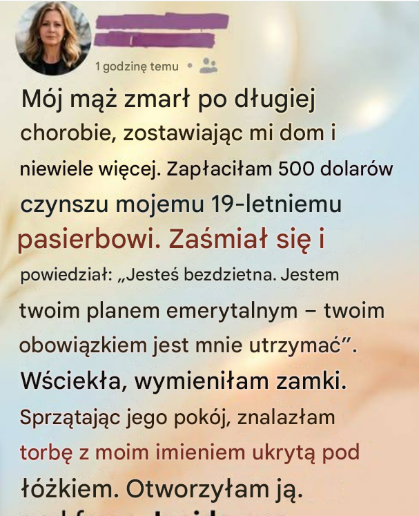 Sprzątając jego pokój, czułam mieszankę gniewu i żalu. Chciałam odzyskać swoją przestrzeń, odzyskać dom, który razem z mężem zbudowaliśmy. Wtedy zauważyłam coś schowanego pod jego łóżkiem: małą, niepozorną torbę z wypisanym na niej moim imieniem.