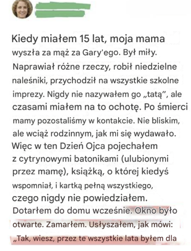 Teraz, mając 25 lat, mieszkając w innym stanie i pracując jako grafik, postanowiłem, że ten Dzień Ojca to czas, by zamknąć tę emocjonalną pętlę. By podziękować. Upiekłem cytrynowe ciasteczka, sięgnąłem po książkę o II wojnie światowej, o której kiedyś wspominał, i napisałem mu kartkę wypełnioną wszystkim, czego nigdy nie powiedziałem na głos. „Nie byłeś moim ojcem z krwi i kości” – napisałem – „ale się pojawiłeś. Zostałeś. Byłeś ważny”.
