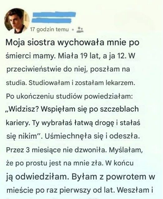 Moja siostra wychowała mnie po śmierci mamy. Miała zaledwie 19 lat, a ja zaledwie 12, wciąż próbując zrozumieć świat, który nagle zmienił się z dnia na dzień. Pracowała po godzinach, porzuciła własne marzenia i dbała o to, żebym miał wszystko, czego potrzebowałem – nawet jeśli oznaczało to konieczność obejścia się bez niej. Ale z wiekiem zacząłem patrzeć na świat inaczej. Poszedłem na studia, pilnie się uczyłem i w końcu zostałem lekarzem. W myślach „udało mi się”. I podczas uroczystości wręczenia dyplomów, stojąc tam w tej chwili dumy, wypowiedziałem słowa, których już nigdy nie cofnę.