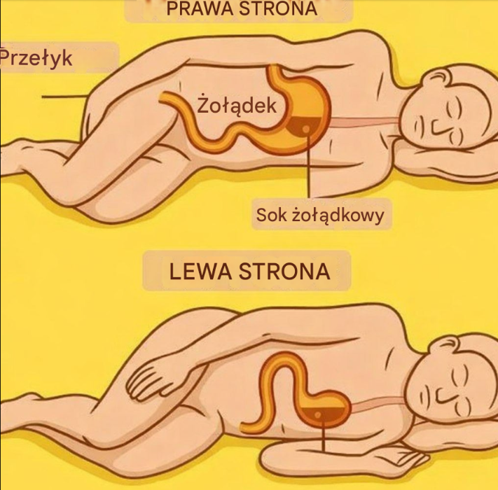 w 2022 roku w czasopiśmie „American Journal of Gastroenterology” wykazało, że osoby śpiące na lewym boku miały o 77% mniejszą ekspozycję na kwas żołądkowy w nocy w porównaniu z osobami śpiącymi na prawym boku. Dlaczego? Wejście do żołądka (wpust) znajduje się wyżej niż wyjście – dlatego ułożenie na lewym boku chroni przełyk przed kwasem.