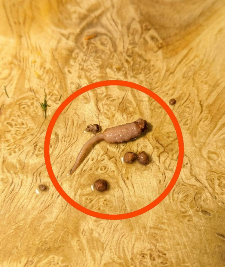 Zdjęcie dziwnego, przypominającego robaka obiektu znalezionego w jedzeniu przyciągnęło ostatnio uwagę w internecie, wywołując zaniepokojenie i dezorientację u wielu osób. Obiekt, zaznaczony pogrubionym czerwonym kółkiem, wydaje się miękki, blady i ma dziwny kształt, leżąc wśród drobnych resztek jedzenia na drewnianej powierzchni.