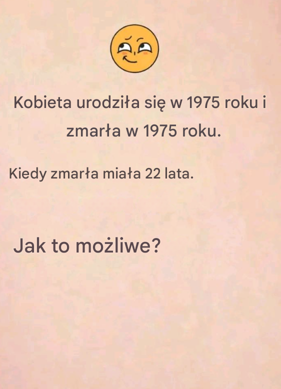 > „Kobieta urodziła się w 1975 roku i zmarła w 1975 roku. Kiedy zmarła, miała 22 lata. Jak to możliwe?”