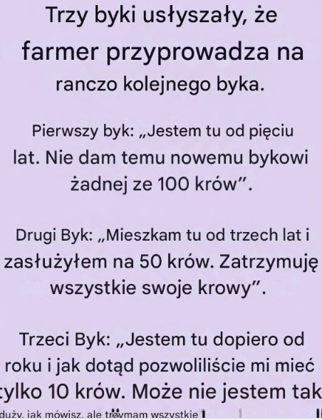 - Pierwszy byk, po pięciu latach dojenia, oznajmił: „Nie oddam żadnej ze swoich 100 krów”.