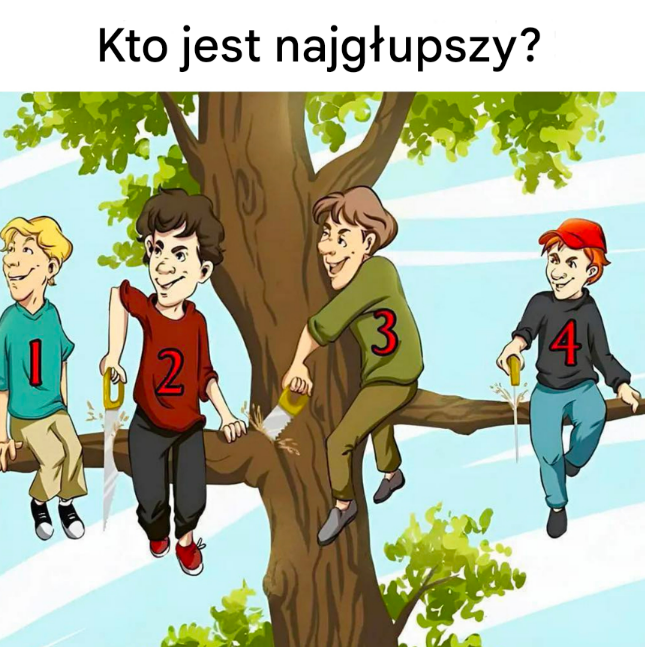 Czwórka dzieci siedzących na drzewie, spokojna atmosfera… aż do momentu, gdy pojawia się piła. W ciągu kilku sekund scena zmienia się i staje się prawdziwą wizualną zagadką. Na pierwszy rzut oka odpowiedź wydaje się oczywista. A jednak prawie wszyscy się wahają. Więc, Twoim zdaniem, kto popełnia największy błąd?