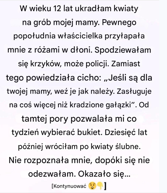 Zmarła rok wcześniej , a mój ojciec pracował po godzinach , zbyt wyczerpany , by zauważyć , jak często wymykam się z domu . Nie miałem własnych pieniędzy . Ale przynoszenie kwiatów na jej grób sprawiło , że poczułem się bliżej niej – jakby odrobina piękna mogła w jakiś sposób przełamać dystans między żywymi a umarłymi .