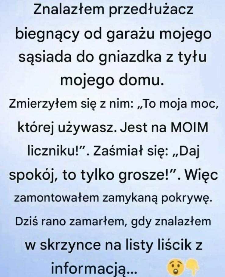 Później tego samego dnia postanowiłem podejść do sytuacji spokojnie. Powiedziałem sąsiadowi: „Hej, chyba przez pomyłkę podłączyłeś się do mojego gniazdka – tak dla twojej wiadomości, to idzie przez mój licznik”. Zbagatelizował to, mówiąc, że to „tylko trochę prądu”, jakby to miało wszystko usprawiedliwiać. Nie chciałem wywoływać napięcia, więc po prostu założyłem na gniazdko małą, zamykaną na klucz pokrywkę – prostą, grzeczną granicę, która zapobiegnie przyszłym pomyłkom.