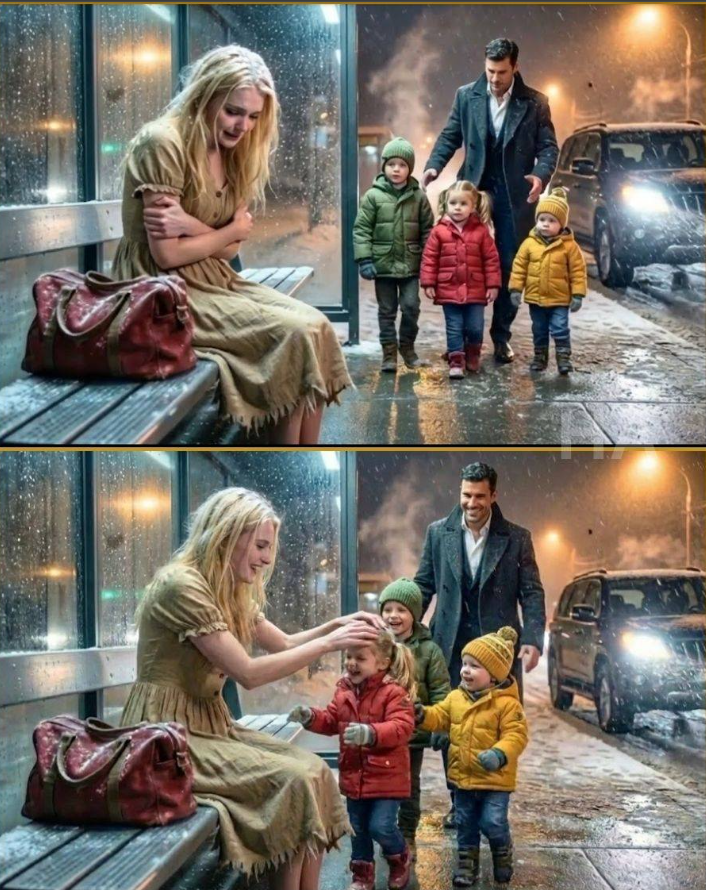 Wysoki mężczyzna w granatowym płaszczu stał tam z trójką dzieci owiniętych w kożuch, z szeroko otwartymi z niepokoju oczami. Dziewczynka pociągnęła go za rękaw i wyszeptała: „Tato… ona zmarzła”.