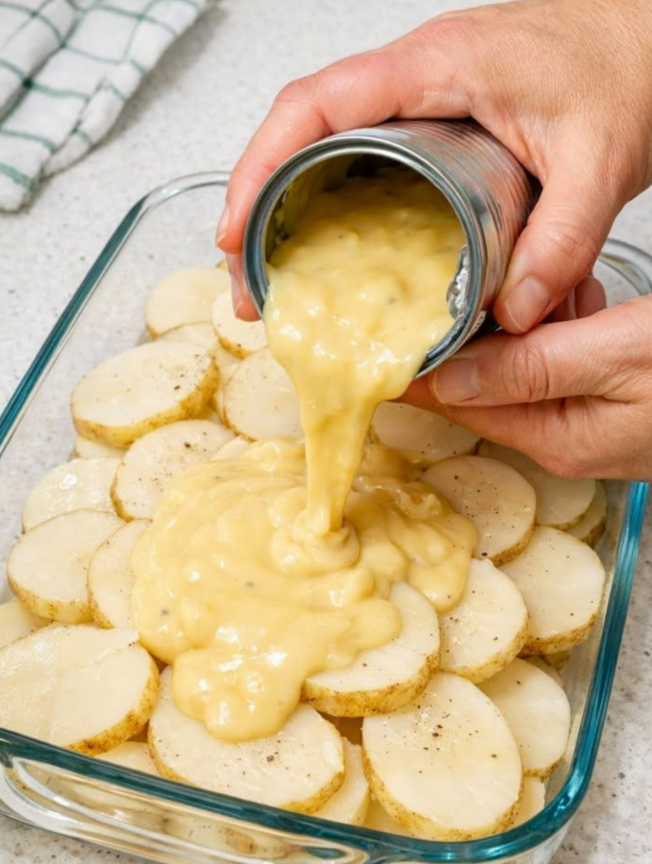 W takich sytuacjach sięgasz po najprostszą formę komfortu: surowe pokrojone ziemniaki + zagęszczony krem z kurczaka + jeden podstawowy produkt z twojej spiżarni, pieczone do miękkości i zanurzone w kremowym, wytrawnym sosie.